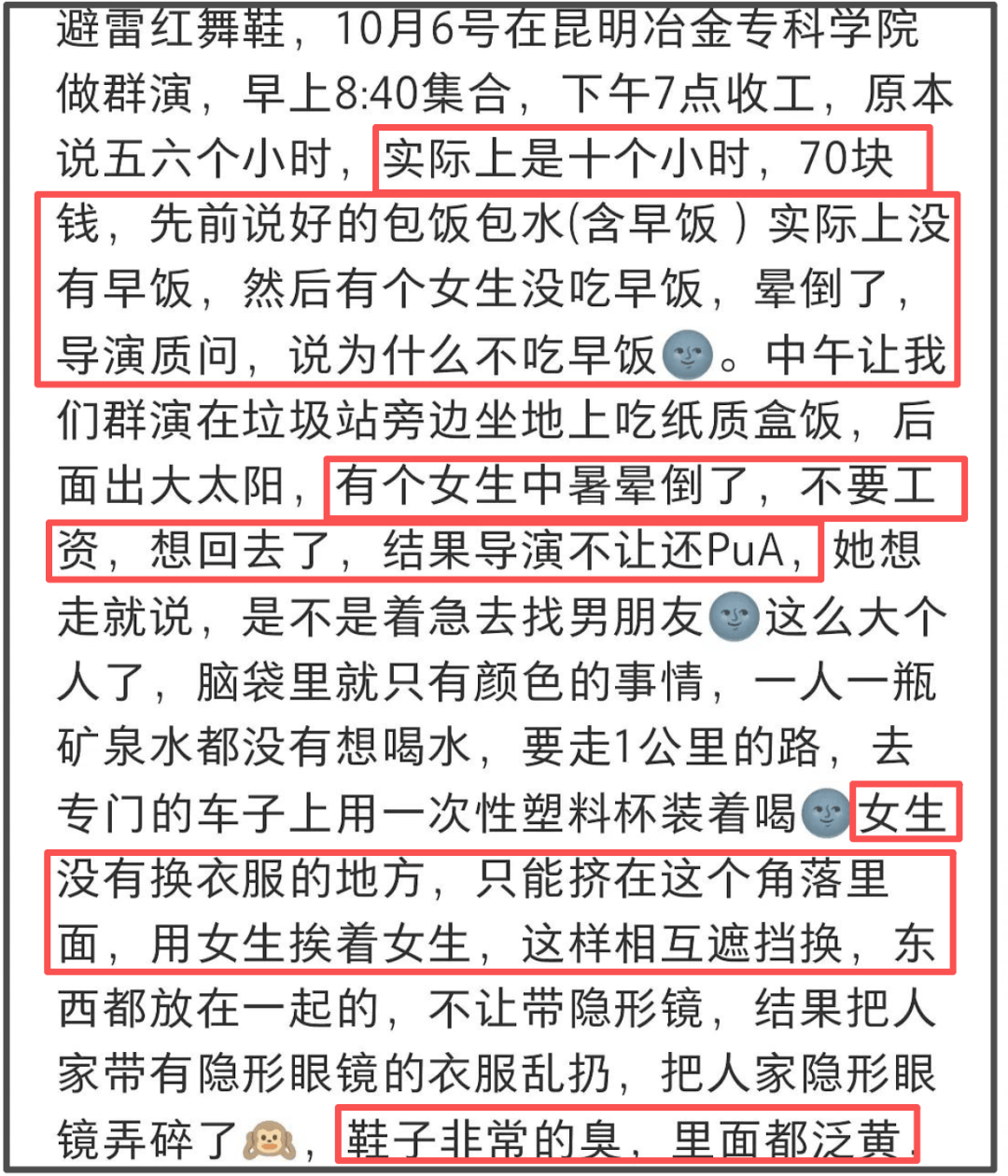 而剧组的下头操作也不止如此,此前有学生发文当群演被粗暴对待,干了十个小时给70块钱,还没有早饭,大热天拍戏女生中暑晕倒还被pua,换衣服更是连更衣的地方都没有,女孩们只能挤在角落里人肉遮挡,道具也是又脏又臭等等。
