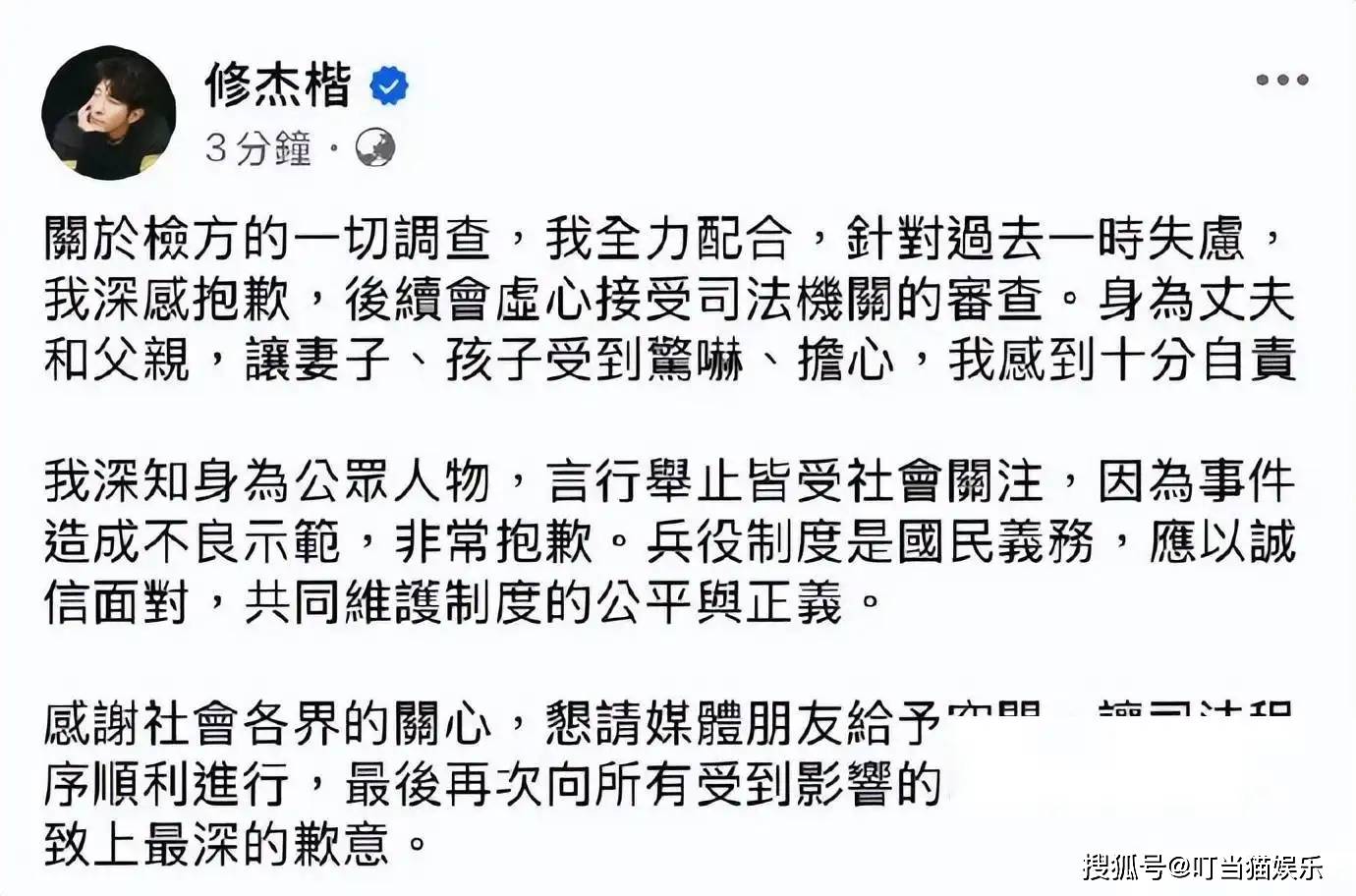 前言 近日,一则关于艺人修杰楷的消息引起了社会的热议和热议。修杰楷因涉嫌伪造病历逃避兵役,被警方拘留并交保,随后他在社交媒体上发布了一篇长文道歉,承认自己的错误,并表示将