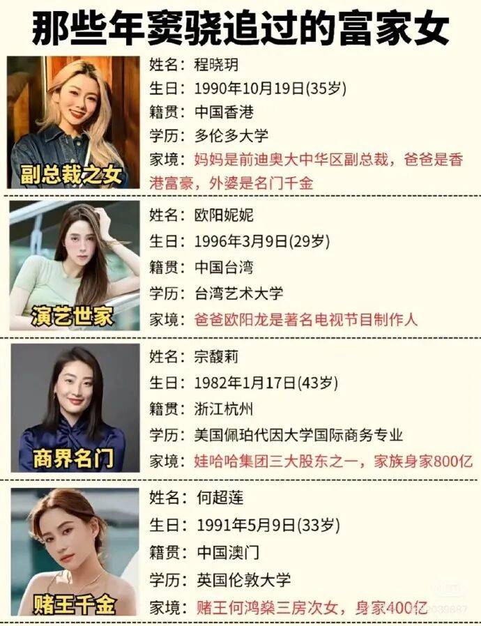还有网友整理所谓“窦骁历任富家女关系图”,这里面有程晓玥、欧阳妮妮、宗馥莉、何超莲),但除何超莲外均无实锤。