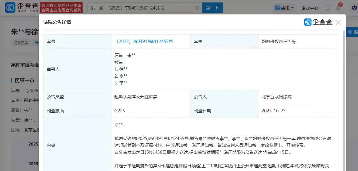 近日,企查查APP显示,法院刊登朱一龙起诉李某1、李某2、徐某某网络侵权责任纠纷一案起诉状副本及开庭传票。据悉,该案计划将于举证期满后的第3日,在北京互联网法院开庭审理。