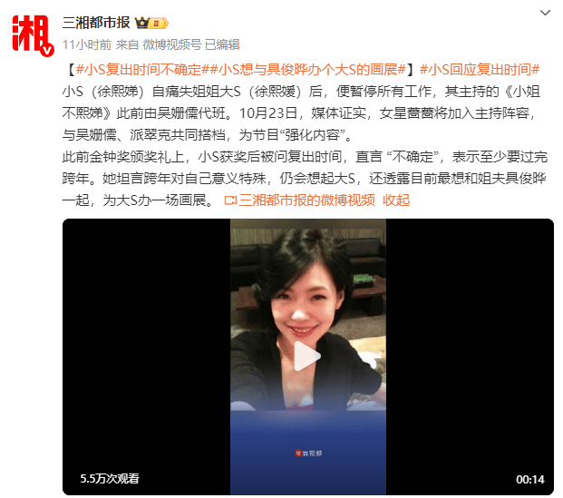 此前金钟奖颁奖礼上,小S获奖后被问复出时间,直言 “不确定”,表示至少要过完跨年。她坦言跨年对自己意义特殊,仍会想起大S,还透露目前最想和姐夫具俊晔一起,为大S办一场画展。