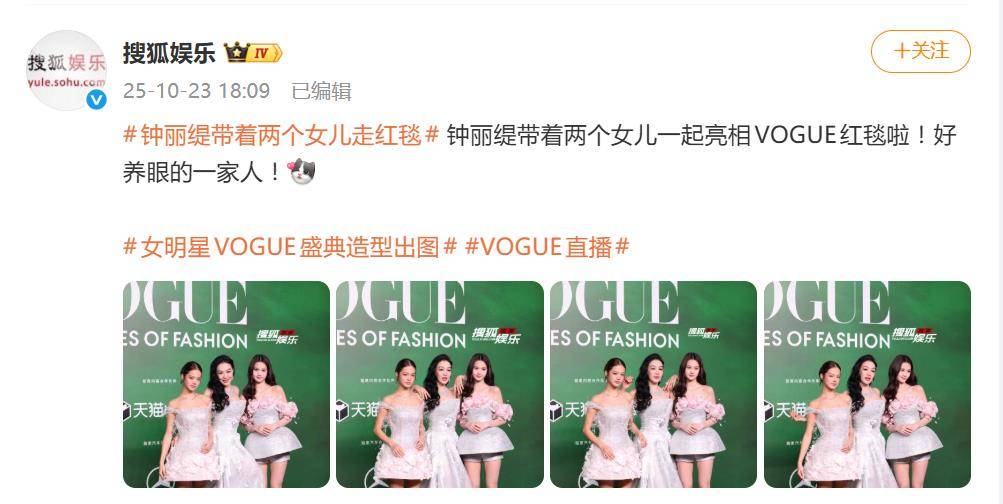 10月23日的VOGUE时尚盛典红毯,被钟丽缇和她的两位女儿彻底“霸屏”。55岁的钟丽缇带着17岁的Jaden(张思捷)和15岁的考拉(张凯琳)一同亮相,三人全程牵手互动的温馨画面,以及各自惊艳的造型,瞬间在社交平台刷起“养眼”“视觉盛宴”的惊叹。