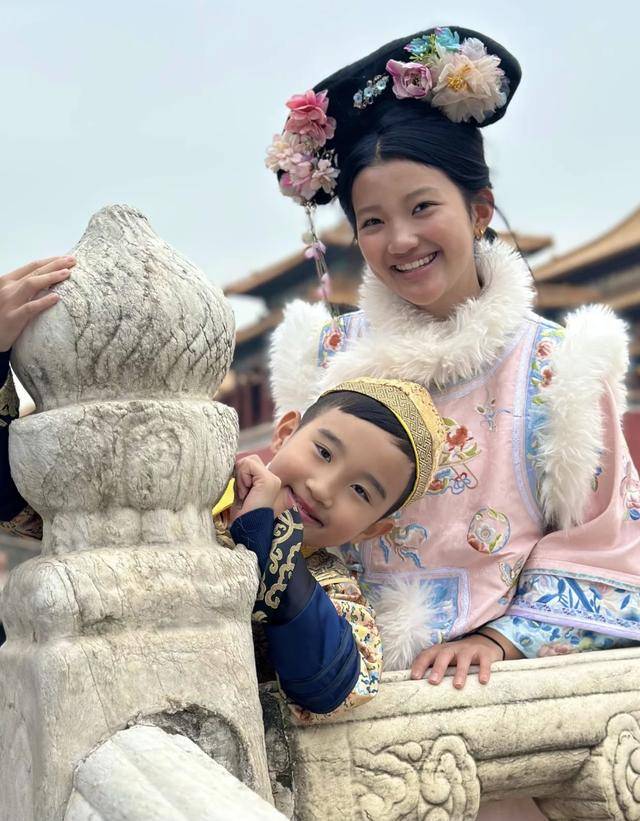 而曹敏莉的大女儿则是穿着和妈妈差不多的格格装,她的身高几乎超过了曹敏莉,不过皮肤稍微有些黝黑,脸型虽然像妈妈,但是眉眼间还是神似爸爸。