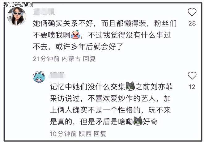 有网友感慨杨幂刘亦菲的关系确实不好,甚至到了懒得装的地步。至于原因,有网友猜想是刘亦菲不喜欢爱炒作的艺人,而杨幂这些年因为种种经常需要营销,两人道不同不相为谋,自然就疏离了。此外杨幂和唐嫣也渐行渐远,而刘亦菲和唐嫣关系依然深厚,刘亦菲还坦言每次去上海不喜欢住宾馆就住在唐嫣家。