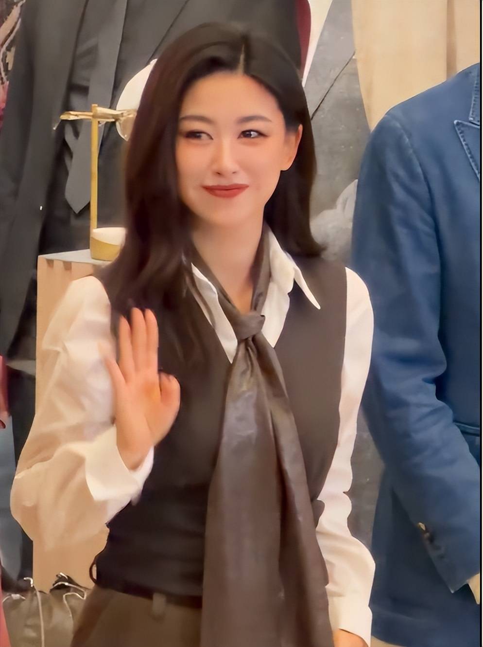 白衬衫配深色马甲,红唇一笑直接封神,网友都说这状态比她9月米兰时装周那套BV造型还能打。