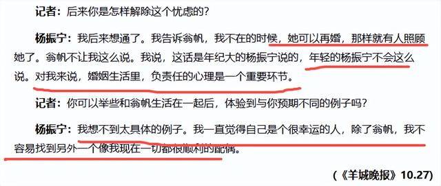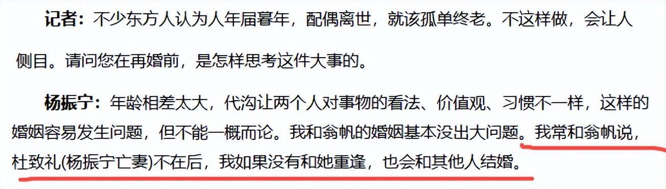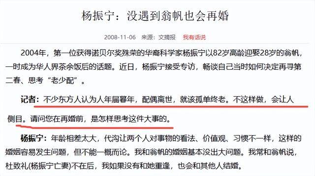 但翻看杨振宁过往的采访和谈话就知道,他和翁帆在一起,无关年纪与外貌,甚至坦诚 “没有她,也会有别人”。