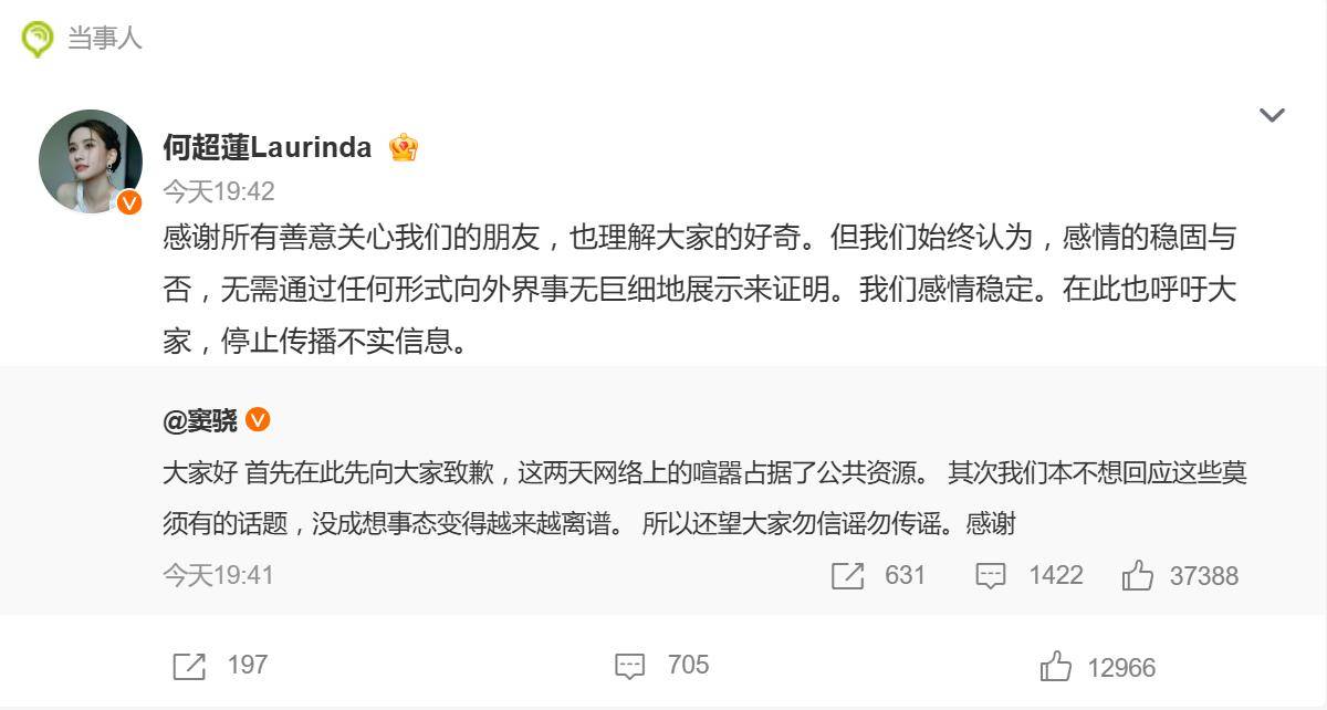 眼看舆论发酵,事态愈演愈烈,正主终于坐不住了。10月23日,窦骁亲自发文,将传闻定性为“莫须有的话题”,并呼吁“勿信谣勿传谣”。何超莲紧随其后转发,明确表示“我们感情稳定”,并称感情无需向外人事事证明。夫妻二人联手,给了这波谣言一记结结实实的重拳。