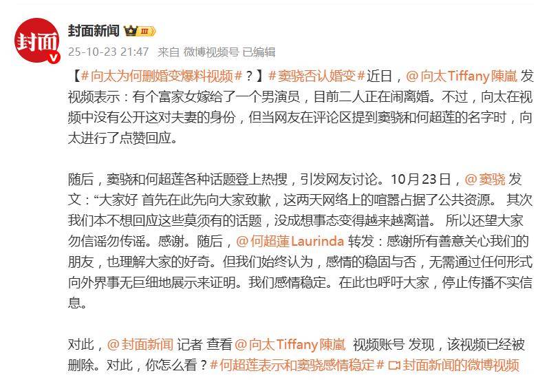 最近,向太陈岚的一番操作,堪称上演了一出“豪门舆论”的闪电解密与光速撤回。一条关于“富家女与男演员闹离婚”的爆料视频,在点赞了网友关于“窦骁何超莲”的猜测后引爆热搜,却又在当事人亲自下场辟谣后神秘消失。这一连串动作,让围观网友直呼:向太为何删婚变爆料视频?
