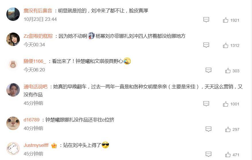然而,光看静态照片可能还真会“误判”。多段现场视频还原了更戏剧性的一幕:原来,钟楚曦较早便站在了合影区的中心位置。在后续人员变动中,她似乎并未主动挪动。当主编刘冲亲自引导杨幂至前排时,就因为钟楚曦未及时让出空间,导致刘冲、杨幂、刘亦菲和古力娜扎四人一度挤作一团,场面略显尴尬,最后全靠娜扎出手拉拽才调整好了位置。她这番“岿然不动”的姿态,被网友犀利点评为“石墩子式站位”,并讽刺道:“明显就是抢的,刘冲来了都不让,脸皮真厚。”