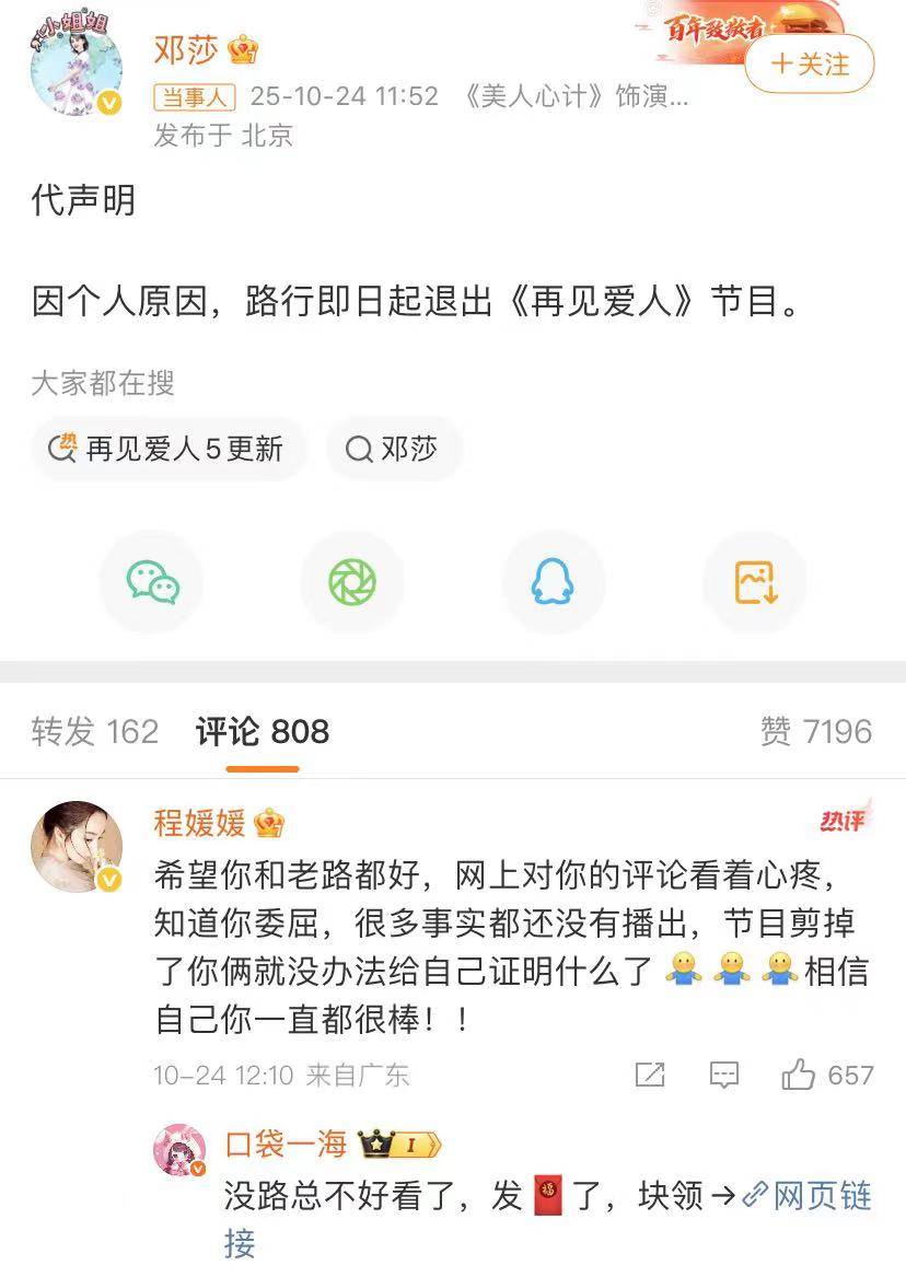 路行塌房上了热搜,然后引发节目延播,再就是邓莎代老公声明退出节目录制,记得在第一期节目上路行还表示自己后悔录节目,结果后悔都来不及,他的镜头被删除了,因为他是一个有争议的人,到了这个时候,路行主动停止录制节目是必须的,节目组一定辛苦加班,忙着删除路行的镜头。