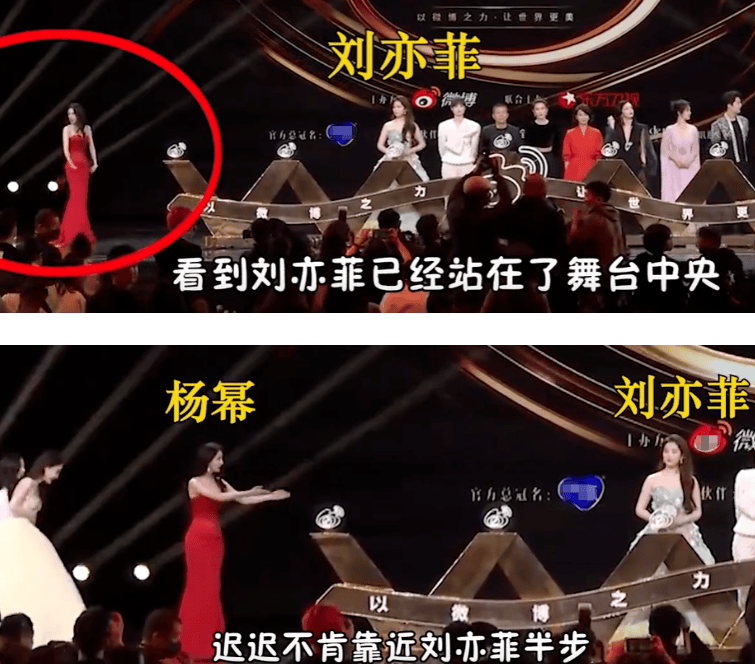 2022年微博之夜,杨幂压轴官宣,身边有好友baby和刘诗诗,刘亦菲也在,当晚出现了两大名场面,一是仙剑系列同框,二是刘亦菲被孤立。