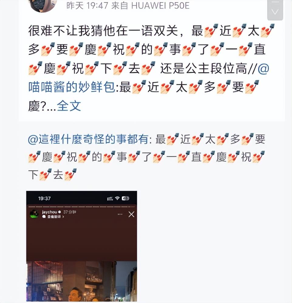 本来只是一次寻常的好友庆祝,但看周杰伦配的文案就有些耐人寻味,他说自己最近经常在庆祝,还希望以后能继续庆祝下去,语气里满满都是轻松和期待,还发了两个放礼炮的表情。