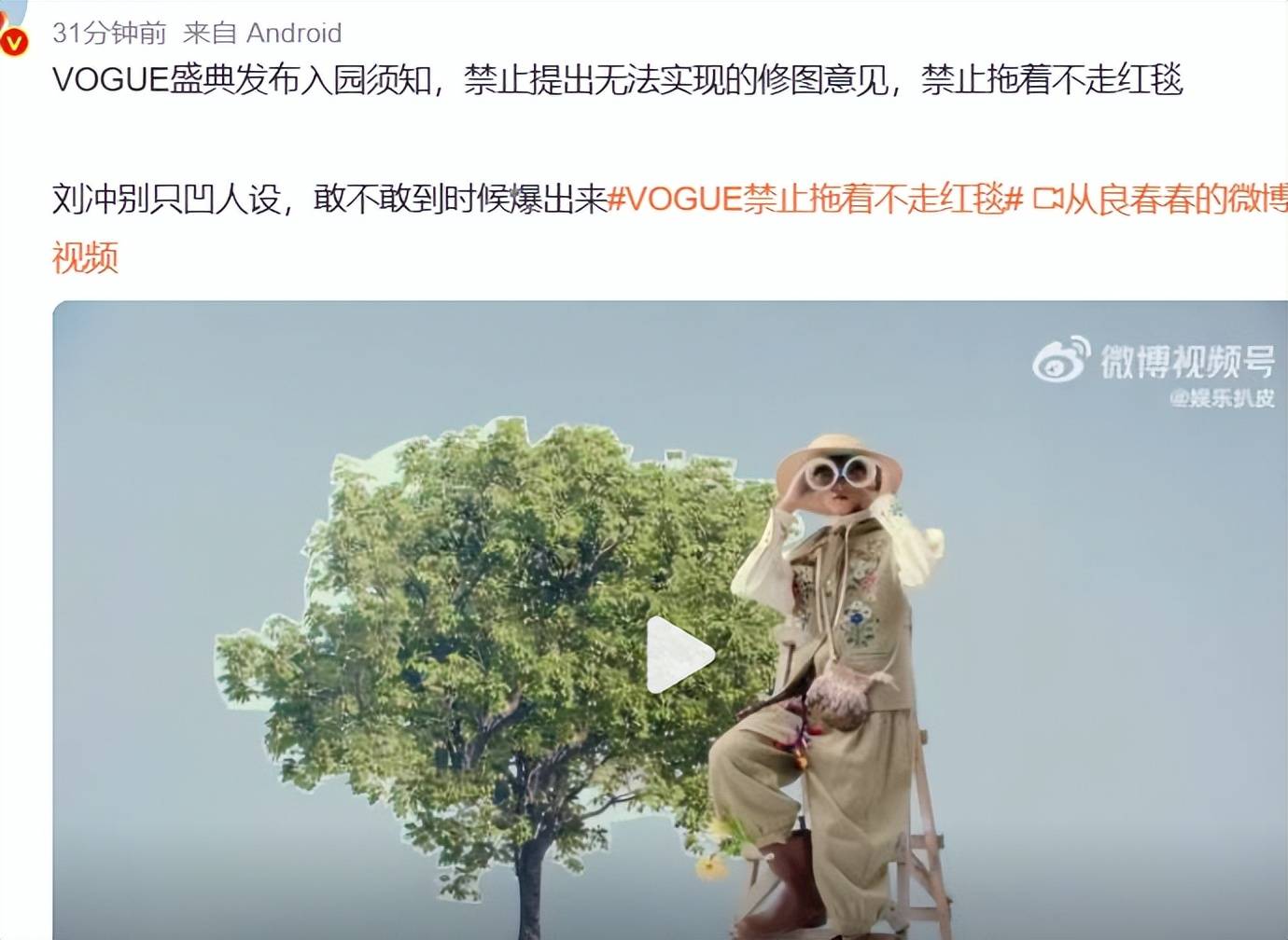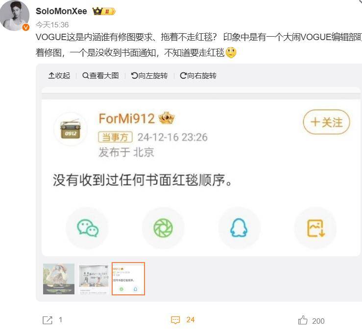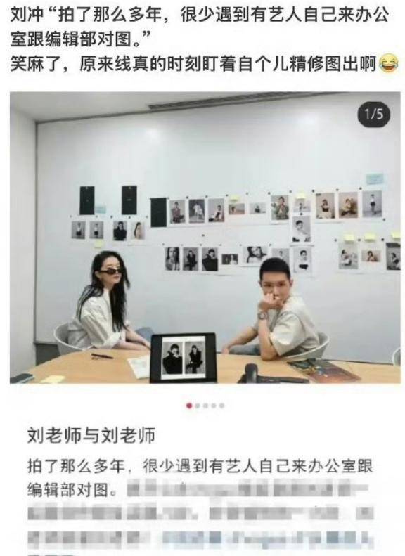 可奇葩的是,vogue主编刘冲之前还真发过一张照片,调侃刘亦菲专程来找自己修图,网友就不免对号入座了。