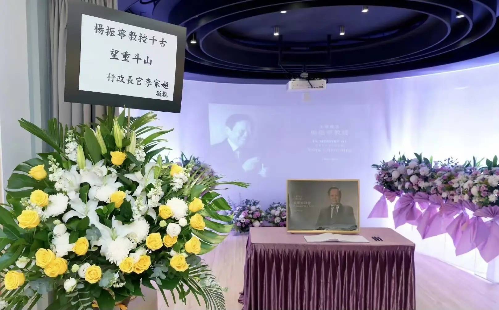 在告别仪式上,看到了李家超送的花圈。这个花篮摆在最显眼的位置,旁边就是追悼会签名的地方。桌子上摆放着杨振宁的海报,紫色的鲜花布置很简洁。