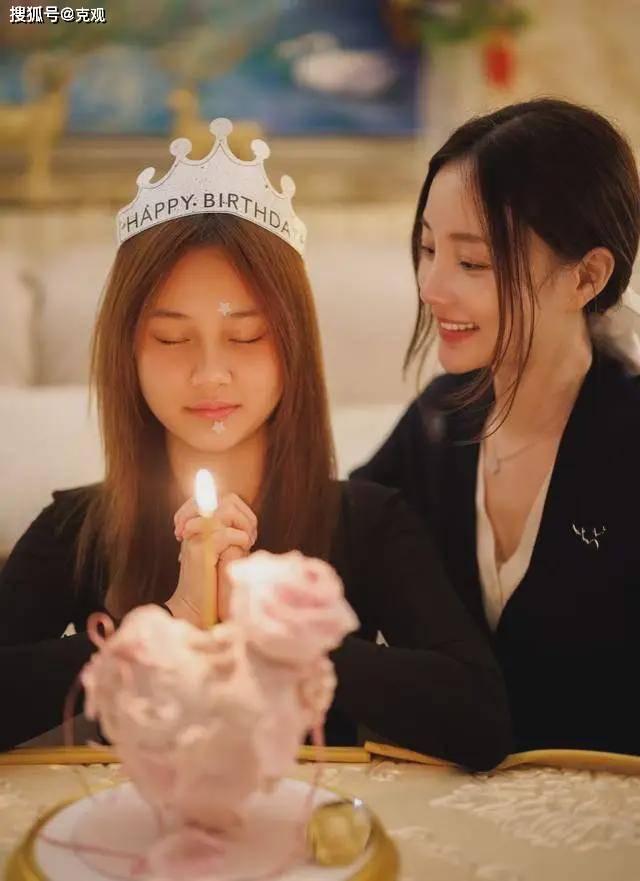 甜馨身着T恤衫,头发染成了黄色看着很精神,她和妈妈一起坐在蛋糕前,李小璐眼神中写满了温柔,看着女儿现在成长为大人模样,当妈妈的心里是最欣慰的。馨戴着皇冠,面前的蛋糕造型非常别致,是个粉色的爱心,正好适合这个年纪的小女生。她正准备吹蜡烛,这张照片眉眼更像贾乃亮。