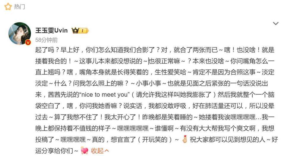 这场盛大的“粉丝圆梦记”高潮,是王玉雯在长文结尾写下的那句引发热议的“想官宣了” 。当然,她没忘记赶紧标注“(开玩笑的)”,但这极度喜爱的夸张表达,早已被网友一眼看穿,调侃道:“这语无伦次的样子,像极了中彩票!”