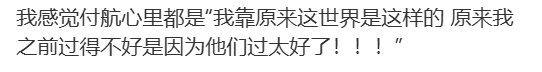 有网友认为,付航的格格不入,是因为他在想:“原来这世界是这样的,原来我之前过得不好是因为他们过得太好了。”