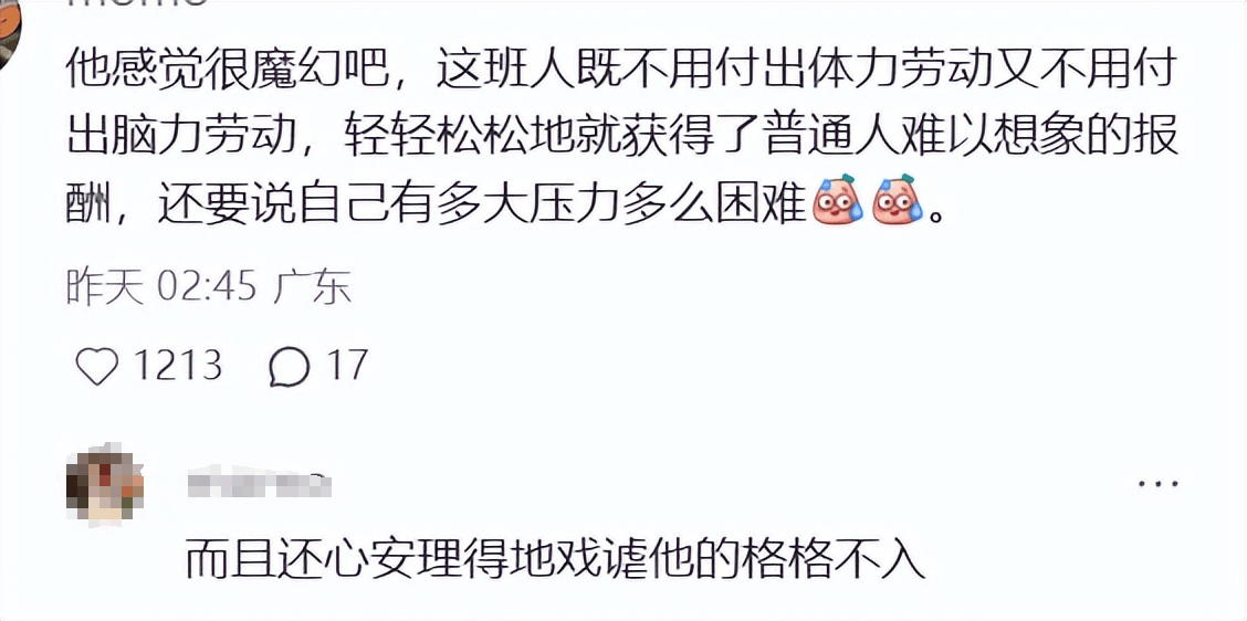 “他感觉很魔幻吧,这班人既不用付出体力劳动又不用付出脑力劳动,轻轻松松就获得了普通人难以想象的报酬,还要说自己多大压力多么困难。”