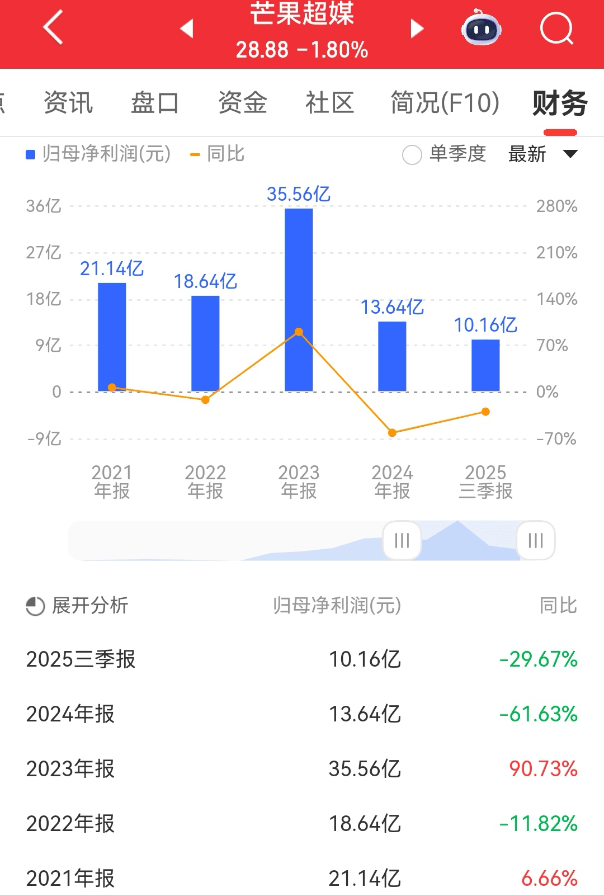 10月24日晚,上市公司芒果超媒公布三季报,前三季度营收90.63亿元,同比下降11.82%。净利润10.16亿元,同比下降29.67%。