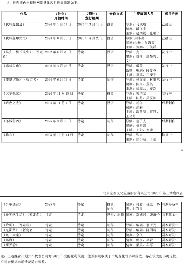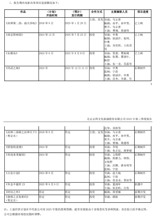 报告期内,北京文化投资的电影《封神第二部:战火西岐》《南京照相馆》《东极岛》已上映,参投的《用武之地》已定档12月31日跨年上映,《封神第三部》《欢迎来龙餐馆》《愤怒的老虎》《火星计划》在后期制作中,《年会不能停2》在拍摄中,《时间之外》《敦煌之玄奘密码》在前期开发中。