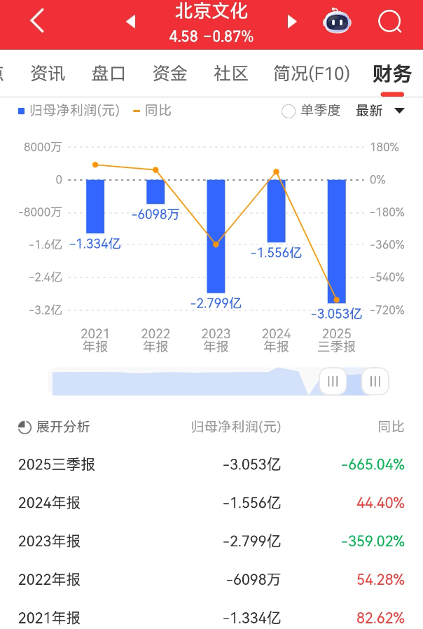 10月24日晚,上市公司北京文化公布三季报,前三季度营收2.5亿元,同比增长151.44%。净利润亏损3.053亿元,同比下降665%。分季度来看,北京文化连续三个季度亏损,第一季度亏损2.179亿