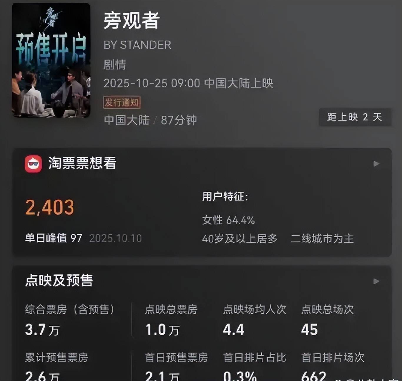10月11日,《寻她》“空降定档”,宣发仅6天,未能触达目标观众。该片采用“艺术时光分线放映”(仅限特定艺术影院排片),导致普通商业影院排片极少,观众购票困难。