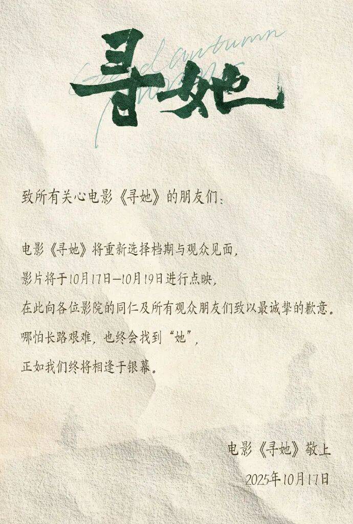 2025年10月17日,《寻她》正式上映仅3小时后紧急宣布撤档,取消原公映计划,改为10月17日-19日全国点映。
