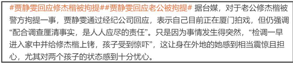 而修杰楷本来挣钱就不如老婆贾静雯多,现在又被爆出逃兵役,他被拘捕的画面还惊吓到了孩子,可能他在孩子心中的形象,再也无法高大起来。