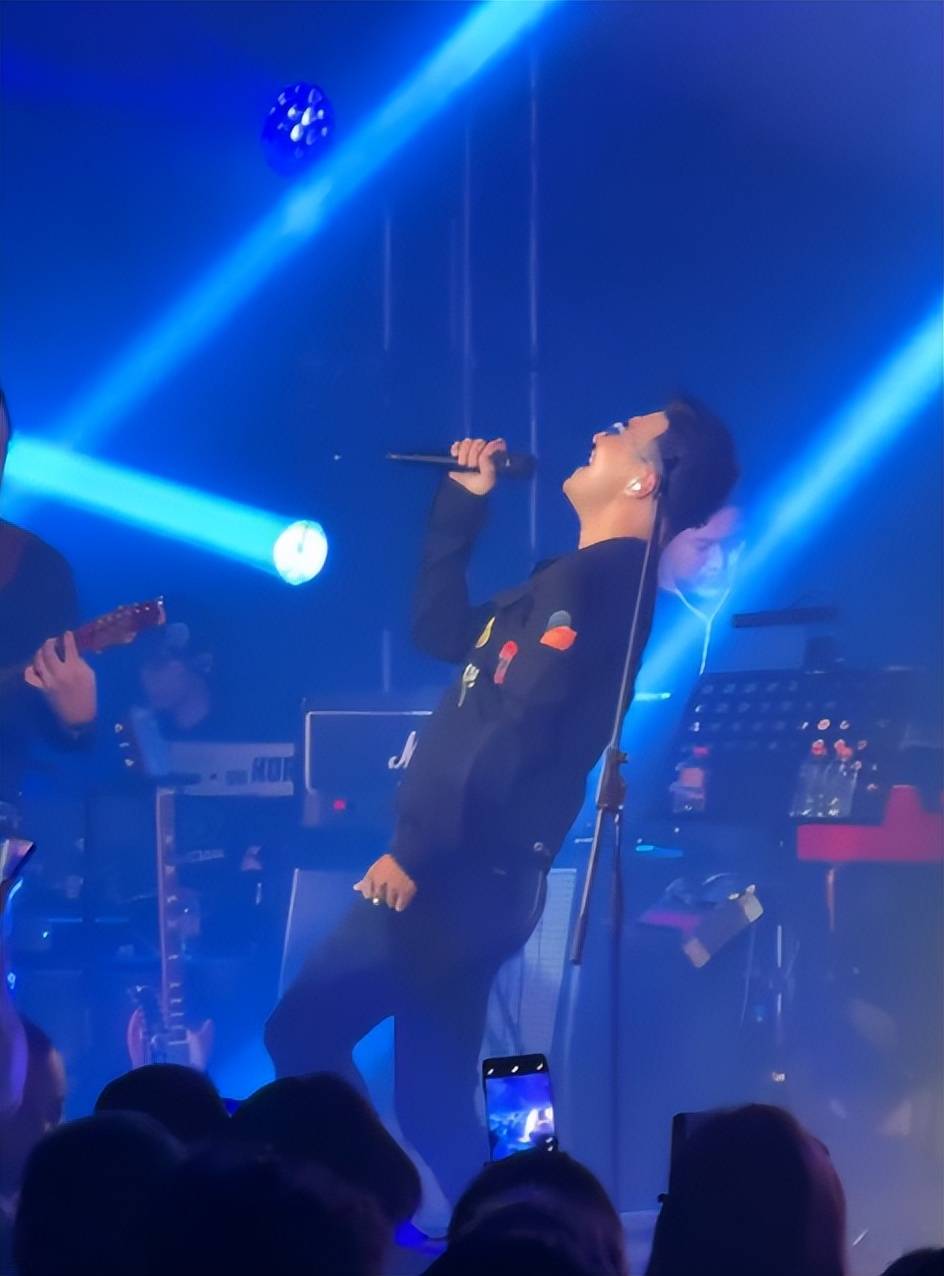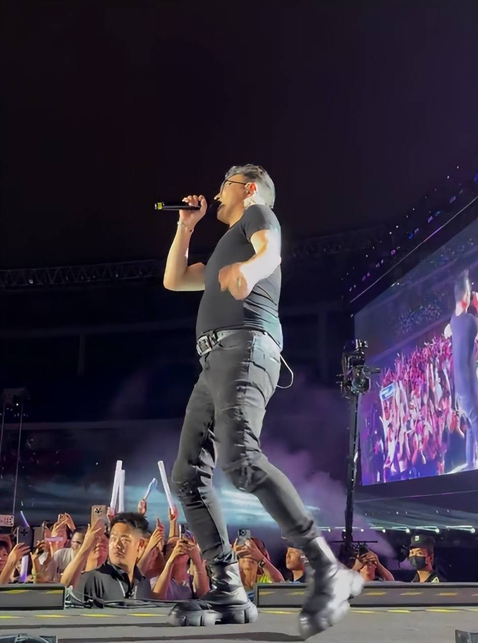 汪峰穿着黑色紧身裤,上身一件简单的黑色外套,看起来确实有些发福。