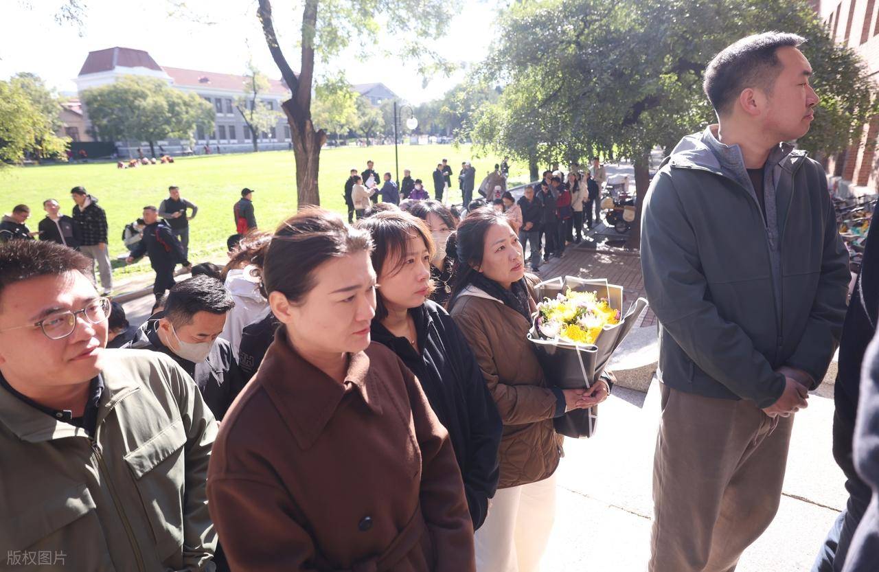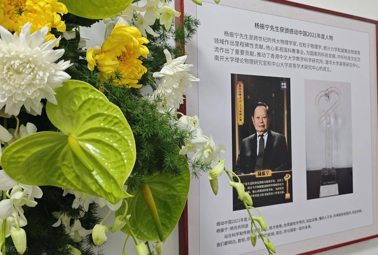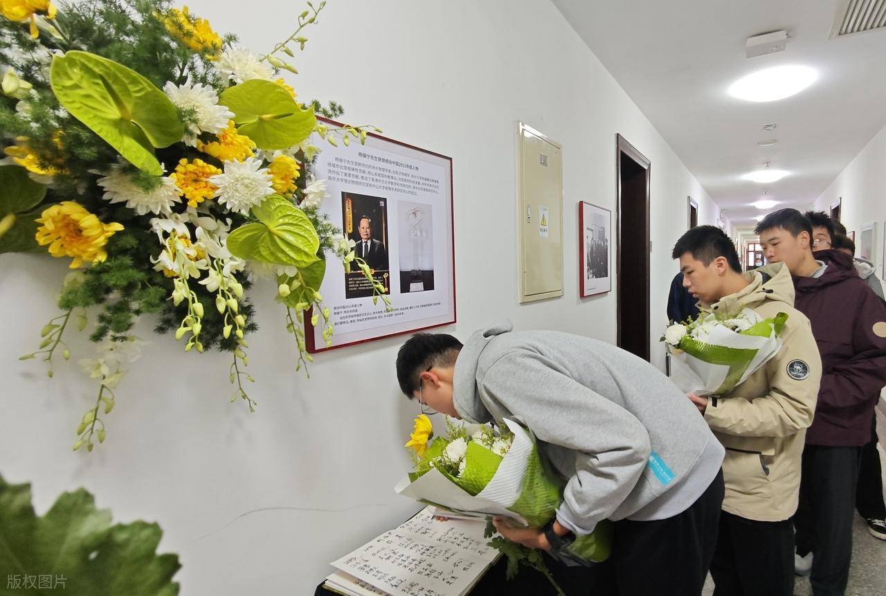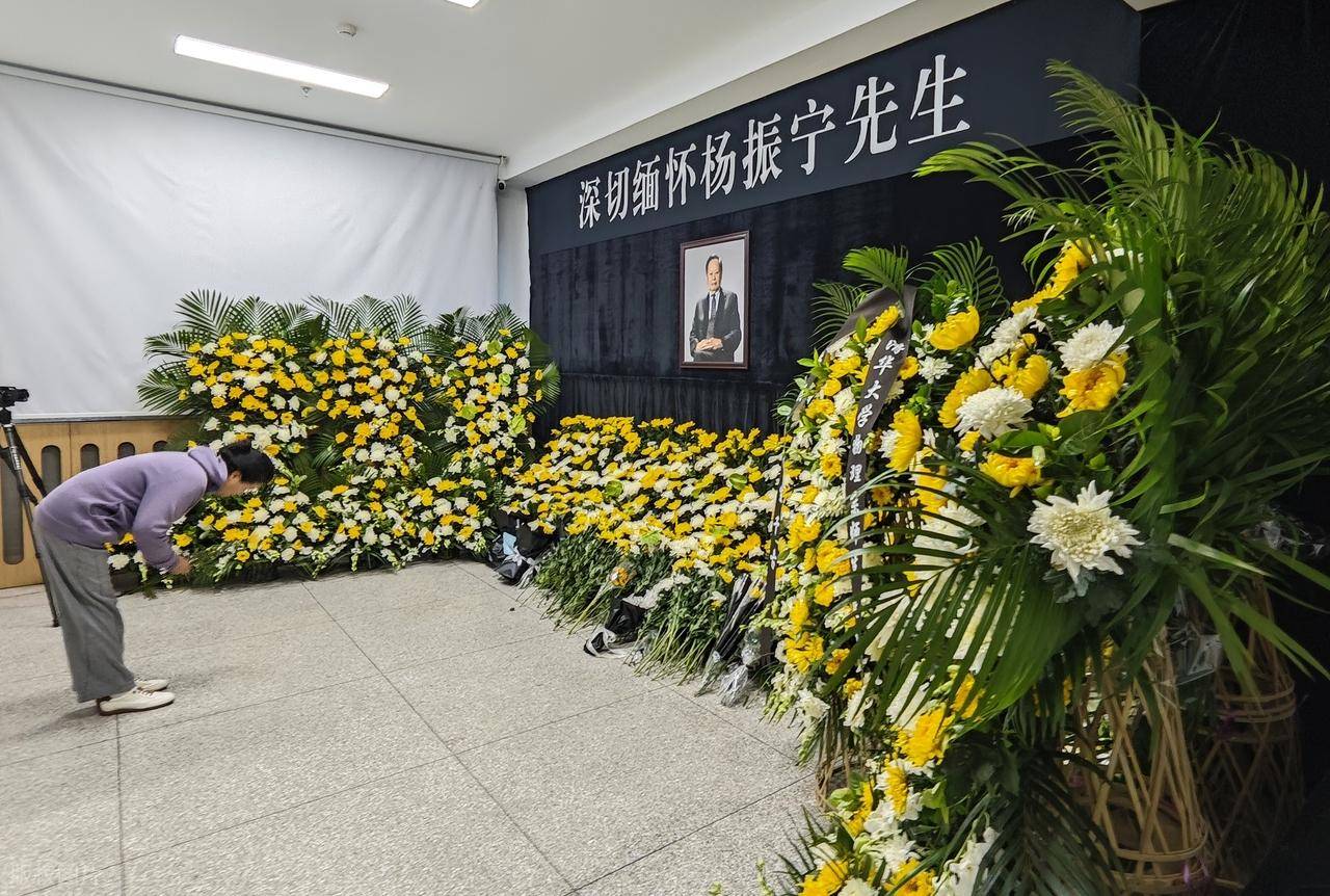 葬礼上抱着遗像的应该是杨振宁的孙子辈,他的遗体覆盖国旗、葬礼办的庄严肃穆。亲友们都身穿黑衣,深情悲痛。先生的离去,每一个人都很伤怀。