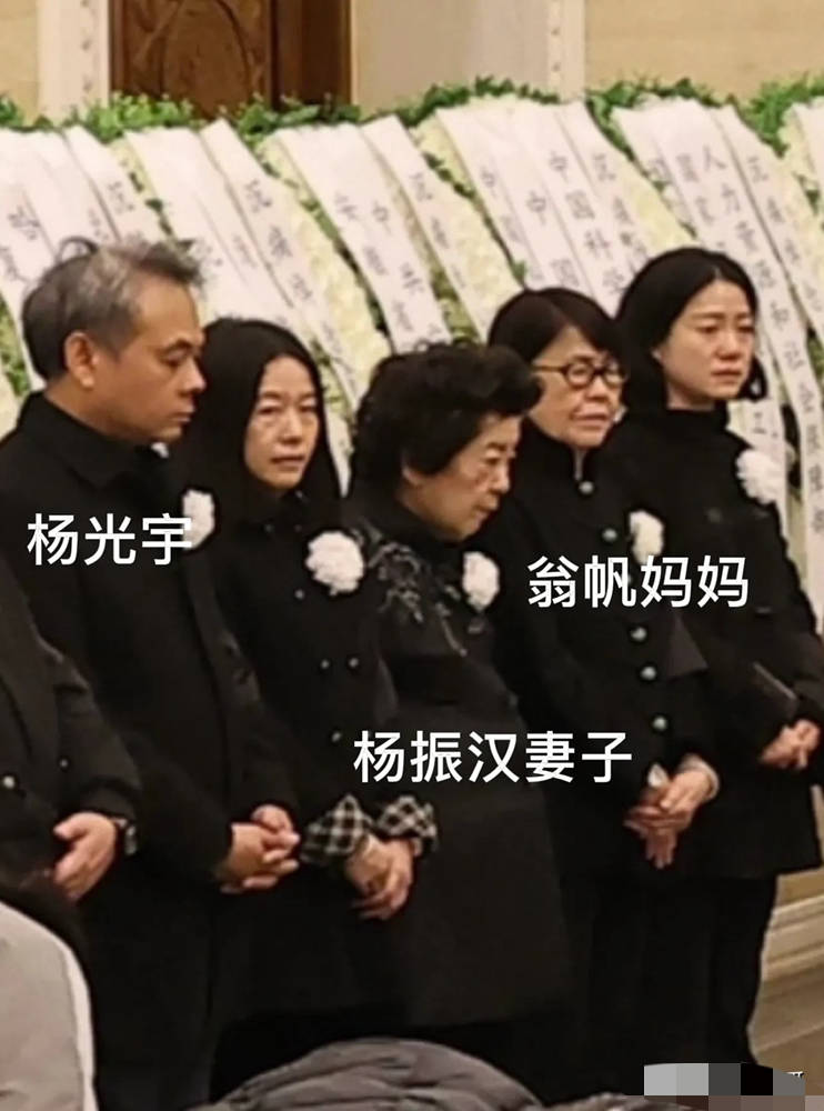 一般而言,葬礼都是平辈或者小辈操持。先生的葬礼,有点不一样。站在首位的是妻子翁帆、第二位是翁帆的母亲石玉钿,第三位是杨振宁弟弟杨振汉的妻子,紧挨着的是杨广宇及其妻子。