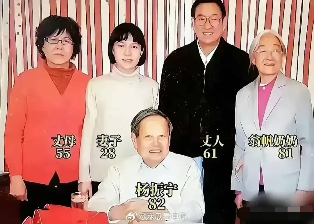 杨振宁和翁帆结婚的时候,已经82岁了。那时候翁帆的奶奶才81岁,比孙女婿还要小一岁。合影的时候,先生坐在前面,翁帆一家人都站在后面。