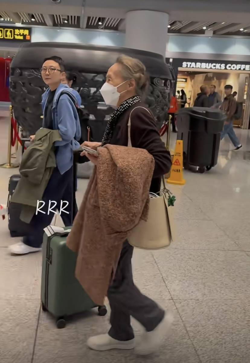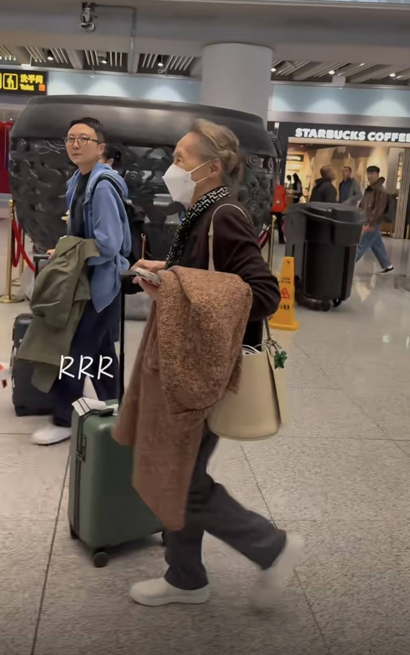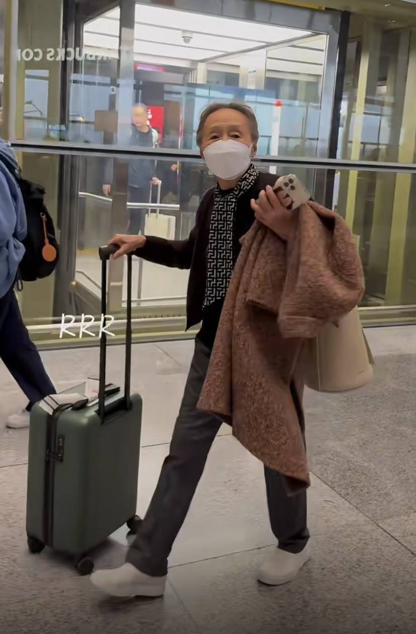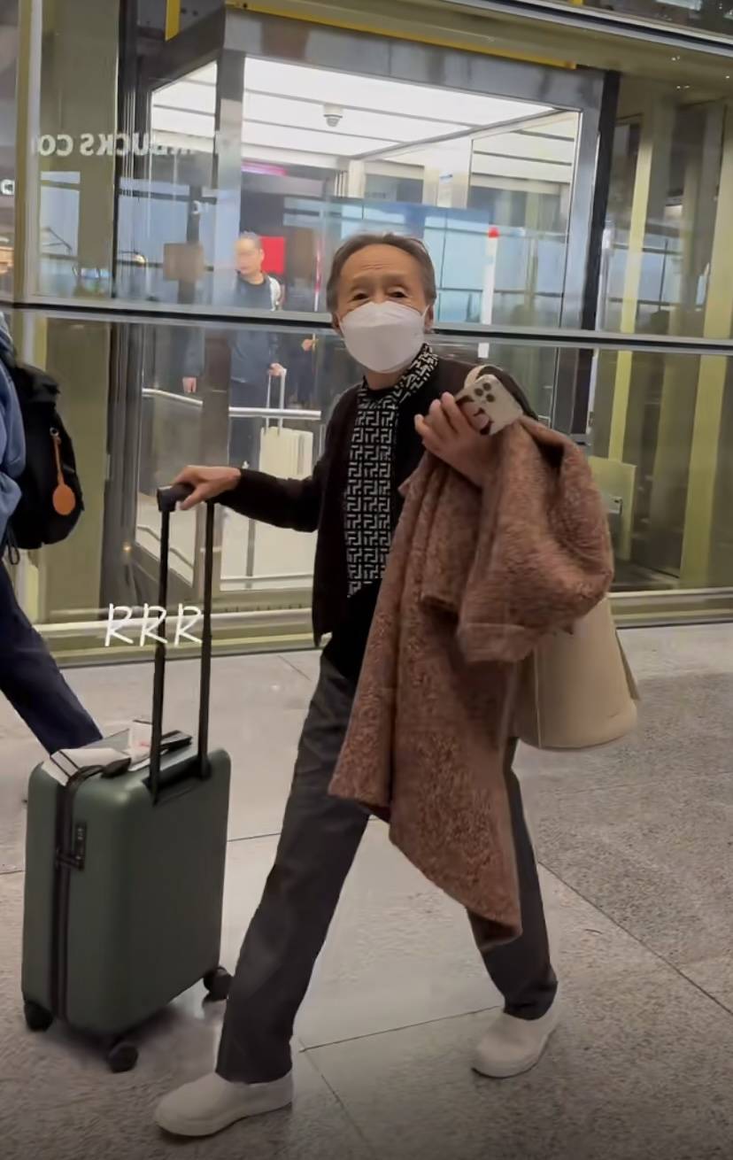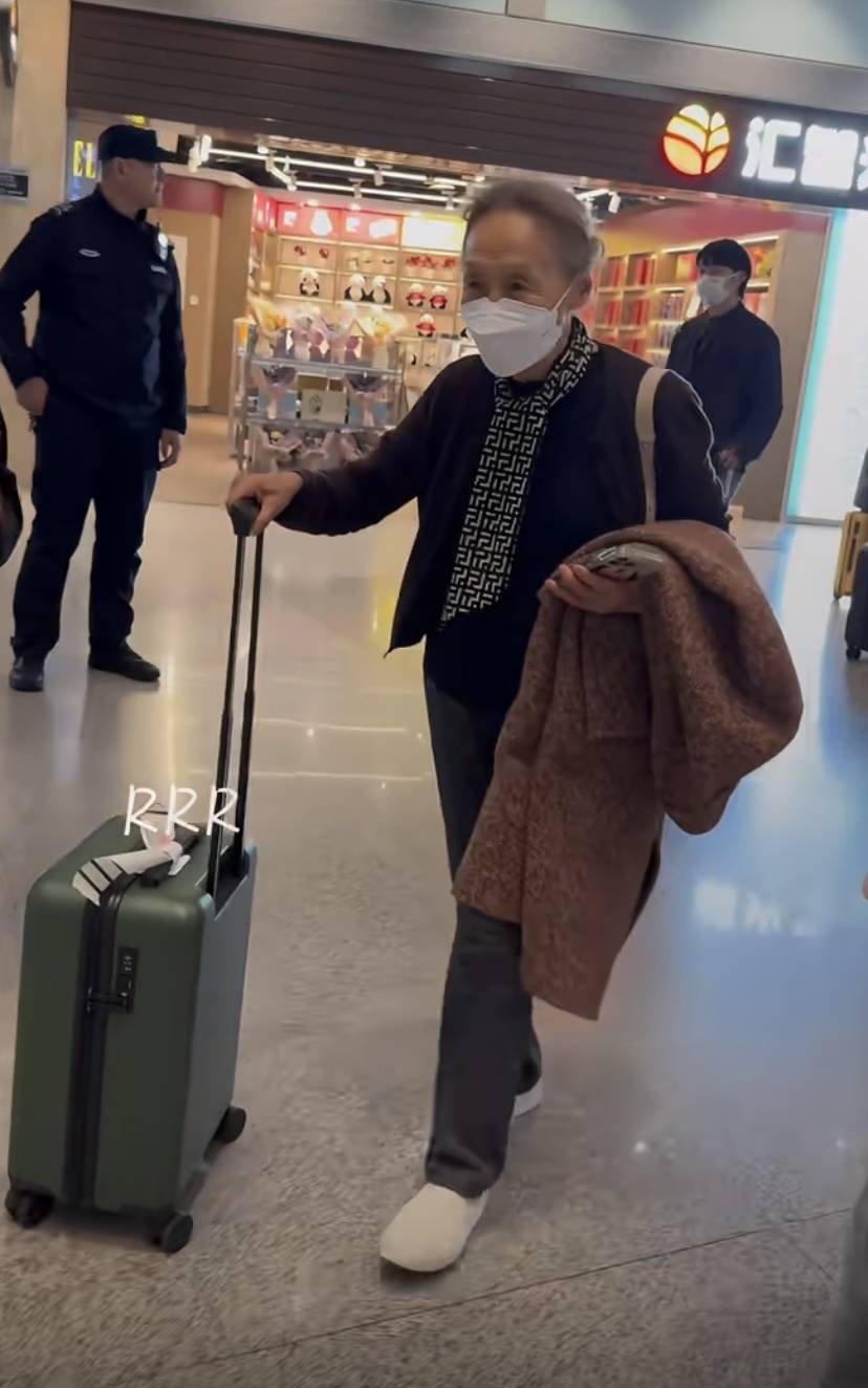 不管是行李箱,还是包包、衣服,全是一个人拿着,并没有麻烦助理帮助。87岁的奶奶,在机场健步如飞,这状态真让人羡慕。