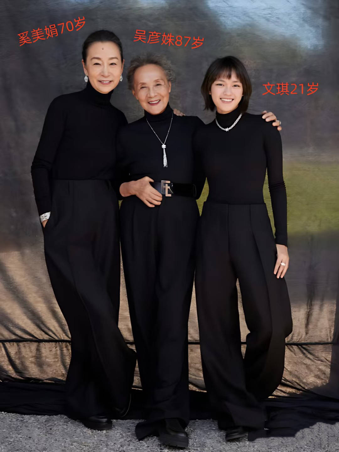 即便是和年轻一辈的女演员同框,吴彦姝那舒展的笑容、也让人觉得很耐看。她穿着黑色打底衫,带着银色的毛衣链,是精致高贵的美。