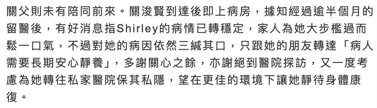 关淑怡的家人没有透露关淑怡的病情,不过有向友人传达稳定的消息,也就是说如今关淑怡虽然还在ICU但是情况已经稳定了下来,但是基于还是要长期安心静养,所以其家人还是不方便接待,谢绝到医院探望。此外,出于对康复的需求,关淑怡的家人还考虑要为其转院,从公立医院转到私家医院,如此一来既能提供更好的环境,也能保护个人隐私。关淑怡的家人始终不希望透露更多相关的私人情况,所以至今关淑怡到底是什么情况被送入院急救的,仍然没有确切地说法。