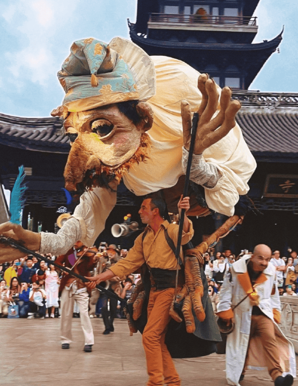 法国的“明天改变一切”剧团带来的《鸟人与他的奇美拉乐队》,凭借一只高达3.7米的“鸟人”木偶灵动地穿梭在古镇石桥游街的浪漫、荒诞之感,在短视频平台爆火出圈。