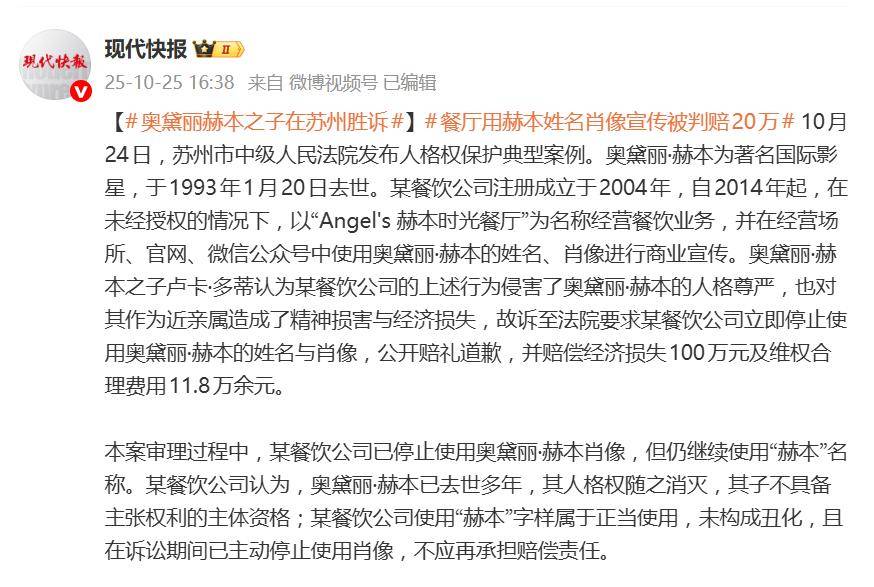 案件经过一审(苏州工业园区法院)和二审(苏州市中级人民法院),法院的判决十分清晰:涉事餐厅必须立即停止使用“奥黛丽·赫本”的姓名,公开登报道歉,并赔偿经济损失20万元。