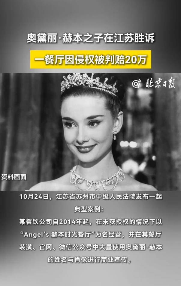 近日,奥黛丽·赫本的次子卢卡·多蒂在苏州打赢了一场官司,瞬间冲上热搜。一家名为“Angel’s赫本时光”的餐厅,因长期擅自使用赫本的姓名和肖像,被法院判决侵权。这场跨越时空的维权,不仅让网友直呼“干得漂亮”,也让人好奇:赫本的儿子是怎么发现苏州这家店的?