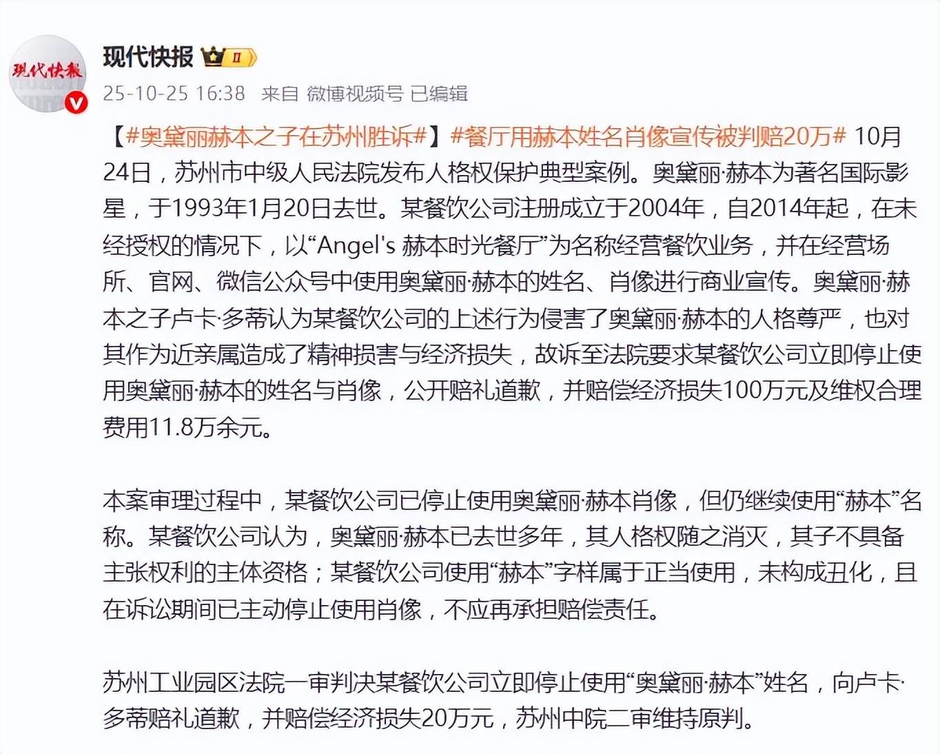 当“Angel's 赫本时光餐厅”的招牌在苏州亮起,悬挂的赫本肖像、印着《罗马假日》经典造型的菜单,以及“赫本同款下午茶”的优雅宣传,构成了一场持续近十年的商业叙事。然而,这场以经典为名的营销,最终在法庭上迎来了它的终章。10月24日,苏州市中级人民法院发布的人格权保护典型案例,为这起跨越时空的纠纷画上了句号——未经授权使用奥黛丽·赫本姓名与肖像的餐饮公司,被判决停止侵权、公开道歉并赔偿经济损失。