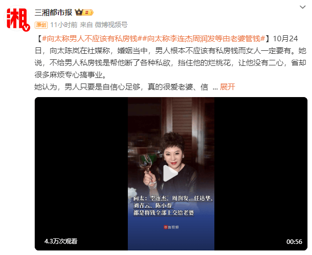 10月24日,向太陈岚在社媒称,婚姻当中,男人根本不应该有私房钱而女人一定要有。她说,不给男人私房钱是帮他断了各种私欲,挡住他的烂桃花,让他没有二心,省却很多麻烦专心搞事业。