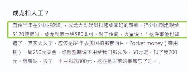 成龙也是如此,据火星透露,成龙有一次在国外拍戏,私自克扣了成家班的薪酬,原本给200美金的酬劳,但成龙却表示给80就行。