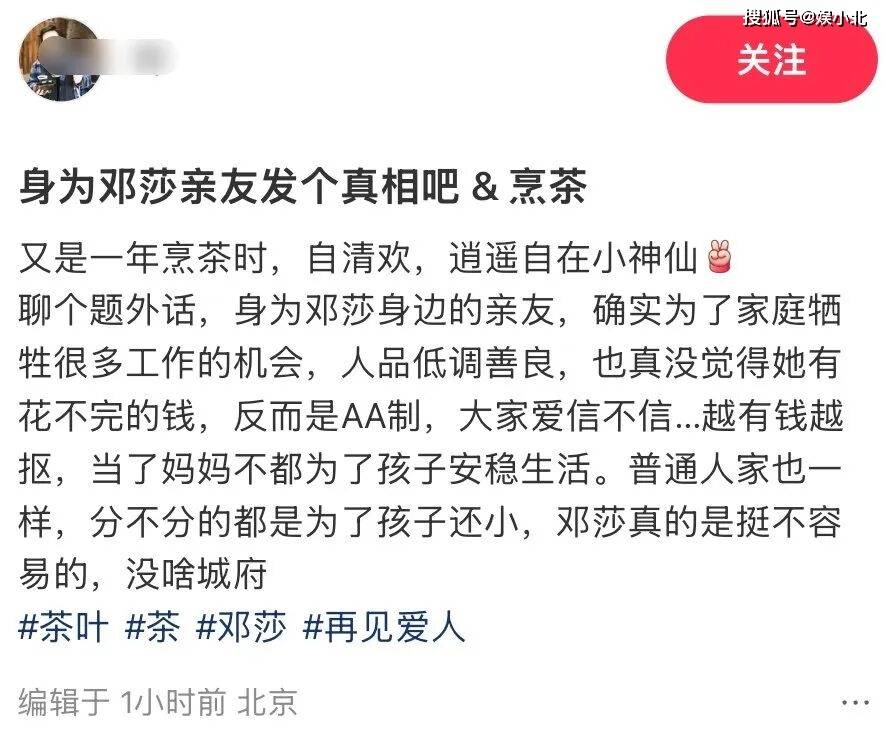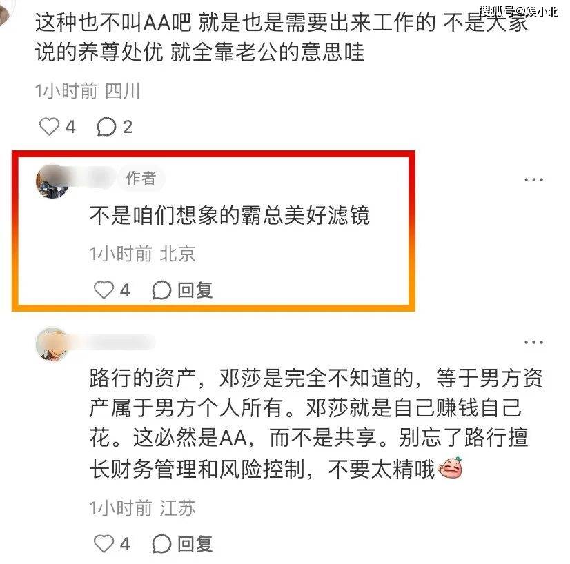 一位自称是邓莎16年挚友并且是她事业上唯一合伙人的网友爆料,邓莎并不是网络上说的那样既要又要还要,路行也并不是网络上说的那样,是个一言不合就给钱的霸道总裁,反而在日常生活中两个人是AA制。