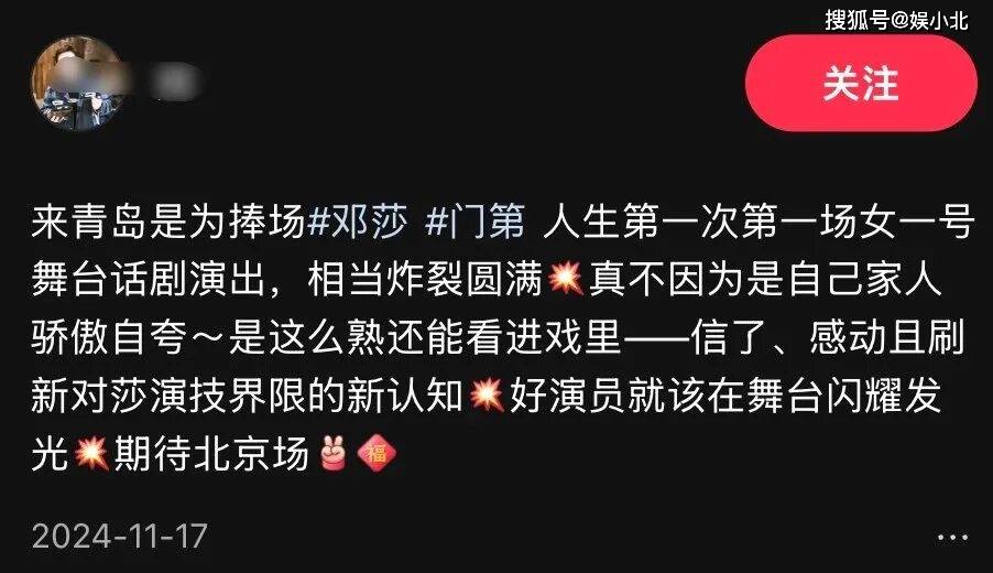 因为就在一年前,她还特意到青岛为邓莎的话剧《门第》捧场,因为这是邓莎人生第一次第一场女一号舞台话剧演出。