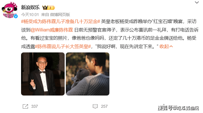 近日,英皇老板杨受成的“红宝石婚”晚宴可谓星光熠熠,也意外成为了娱乐圈热门话题的诞生地。宴上,杨受成爆料陈伟霆在电话里提议“让儿子长大后签约英皇&rdquo