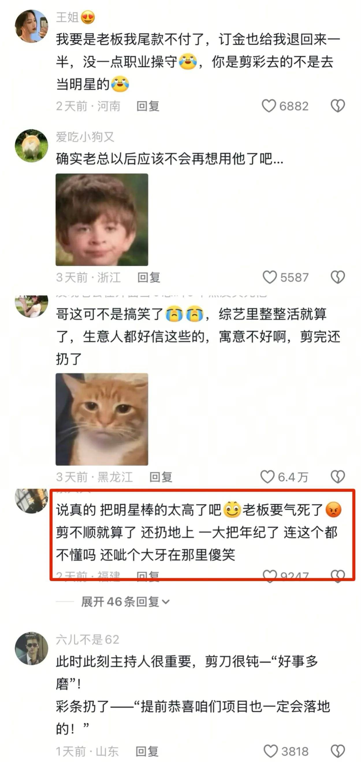 以为自己搞出了节目效果,还在自顾自笑着,将剪下的彩头顺手撇地上,一点没意识到老板的氛围不对,眼睛直盯着脚底的彩头,脸色都僵得发紧。