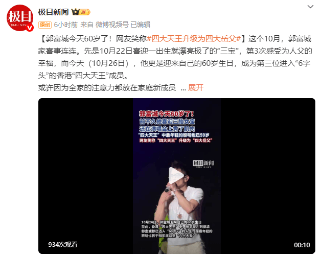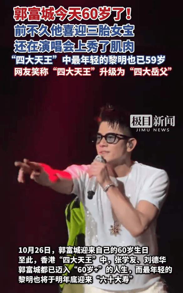 (来源:极目新闻)这个10月,郭富城家喜事连连。先是10月22日喜迎一出生就漂亮极了的“三宝”,第3次感受为人父的幸福,而今天(10月26日),他更是迎来自己的60岁生日,成为第三位
