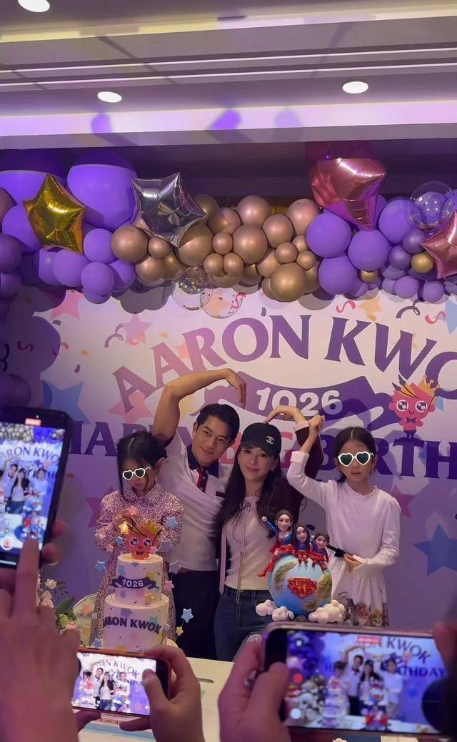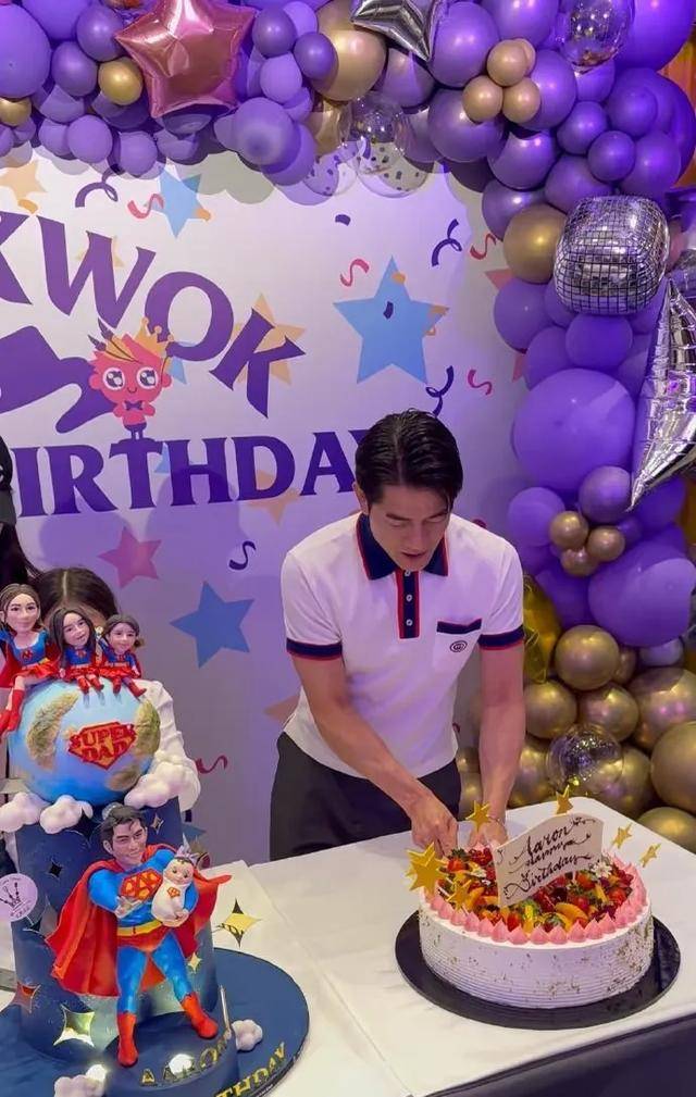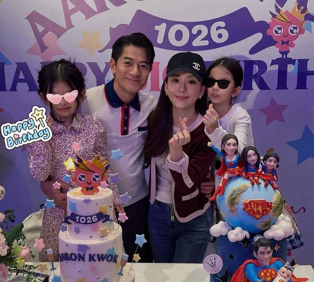 从生日蛋糕的设计上也特别用心,两个生日蛋糕,其中一个蛋糕,是代表郭富城的父亲身份。方媛和两个女儿坐在地球上,而郭富城穿着超人衣服,怀里抱着三胎女儿,这个设定很有意思,作为家里唯一的男性,他像超人一样守护着她们母女四人。