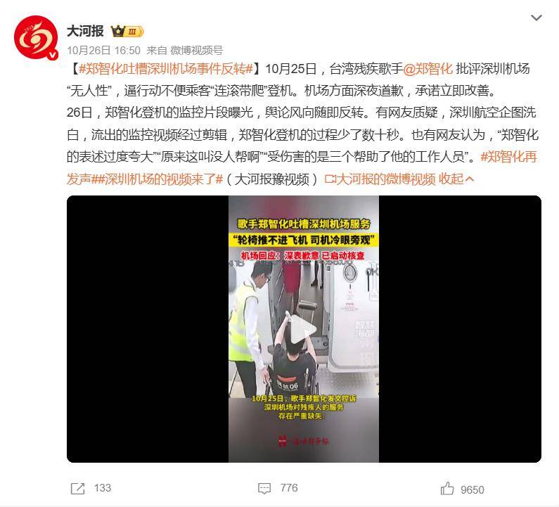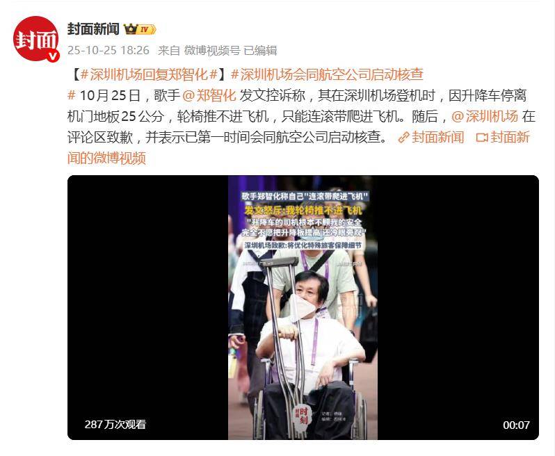 事件起初完全是一边倒的态势。10月25日,郑智化在社交平台详细描述了他的遭遇:由于机场升降车与机舱门存在25公分的高度差,他的轮椅无法直接推进机舱。据他所说,当他请求工作人员调整设备时,竟遭到拒绝和“冷眼旁观”,最终他不得不以“连滚带爬”这种极度狼狈且伤尊严的方式,自行进入机舱。他用“最没人性”评价机场的服务态度。这番控诉迅速发酵,深圳机场当夜火速发布致歉声明,承诺会立即改进服务。