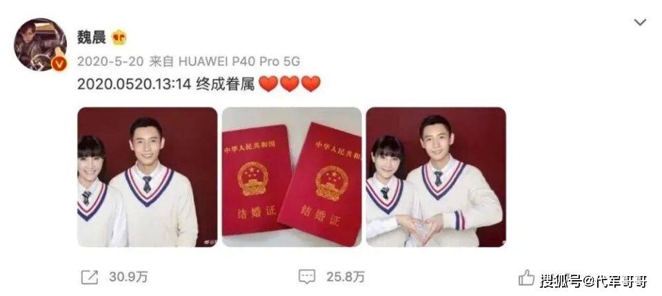 2020 年 5 月 20 日 13 点 14 分,魏晨用自己微博的第 2000 条动态官宣结婚,配图是两人紧握的双手与结婚证,卡点 “2020520”“1314”“2000 条动态” 的细节,被网友调侃 “太会算,把浪漫刻进了时间里”。2021 年三亚婚礼上,请柬上印着的 “晨曦日暮玮此生” 藏头暗号,藏着他对这份感情的承诺;于玮则悄悄将婚礼现场布置成魏晨的应援色橙色,从签到台的装饰到伴手礼的包装,处处都是橙色元素,当魏晨看到这一切时,当场红了眼眶,哽咽着说 “没想到她记得这么清楚”。