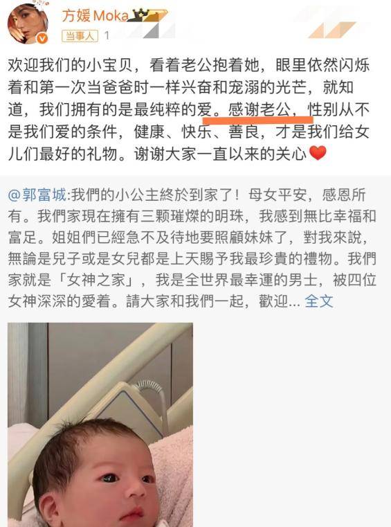 感觉方媛这个人情商真的很高, 孩子一出生, 她发文就是“感谢老公”, 也不说自己多辛苦, 满嘴都是家庭美满, 把功劳都给老公, 给足了郭富城面子,